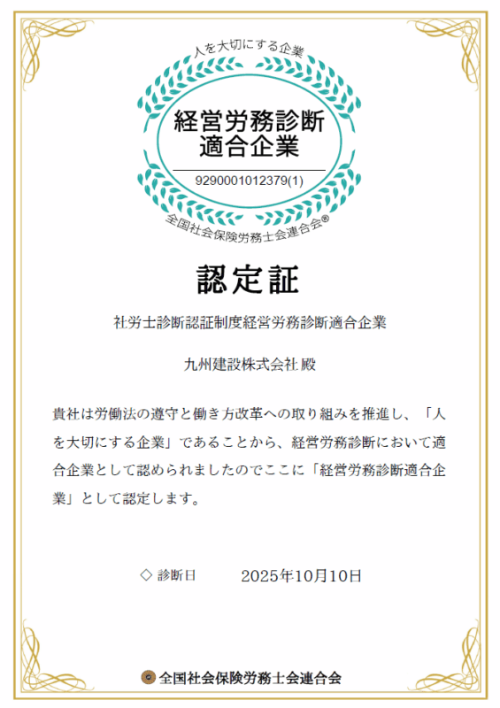 弊社は全国社会保険労務士会より「職場環境改善宣言企業」及び「経営労務診断適合企業」の認証を受けました。
